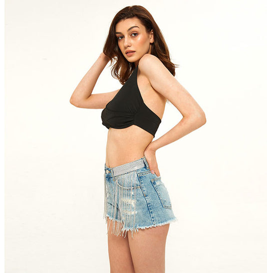 Shimmy Rhinestone High Rise Denim Shorts - Black