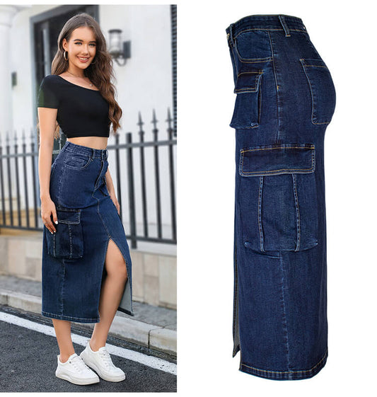 Cargo Denim Midi Skirt