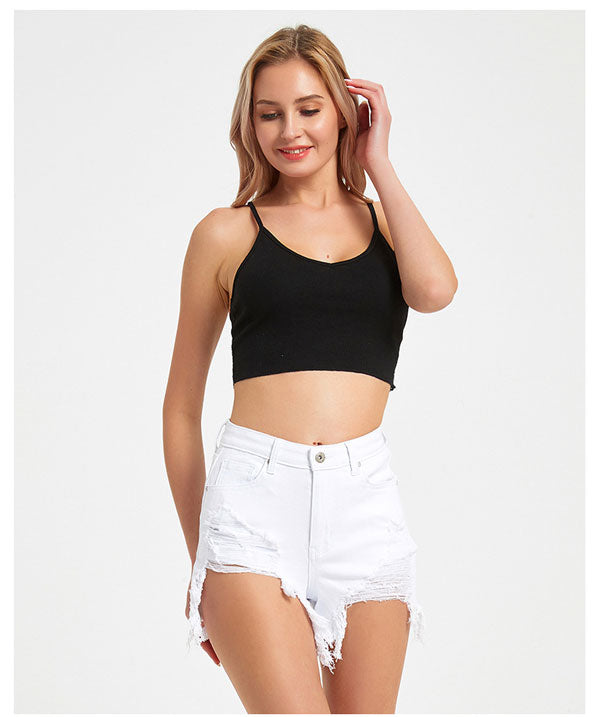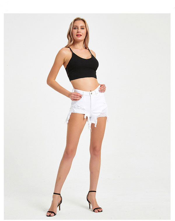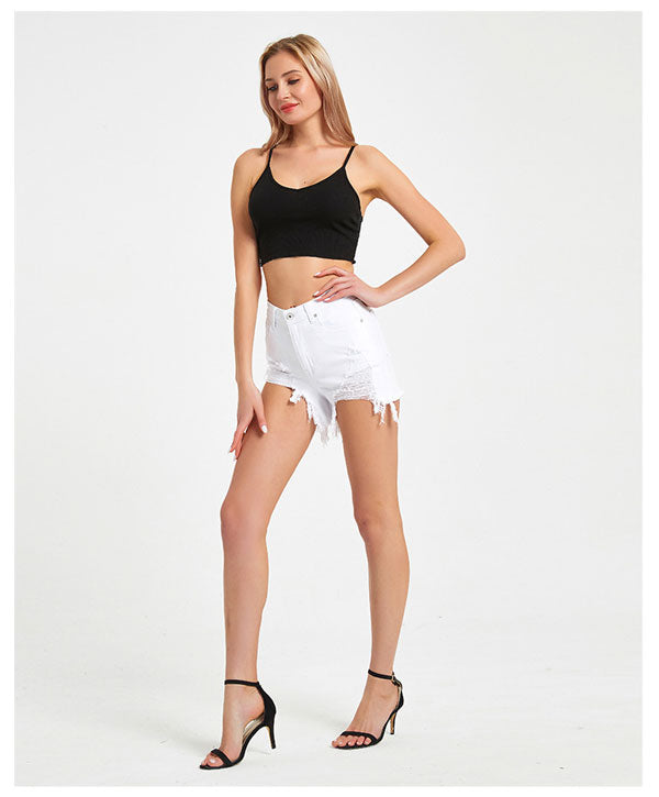 Looking for Beach Outfit that Let you look cute while you're enjoying the sun,sea and sand?Classic White Distressed denim shorts never loses its appeal and gives the coolest of beach looks.A pair of white frayed denim shorts works beautifully with little cami tank top or crop top, whilst a matching shorts and bikini top set in stars and stripes print captures the spirit of beach style completely